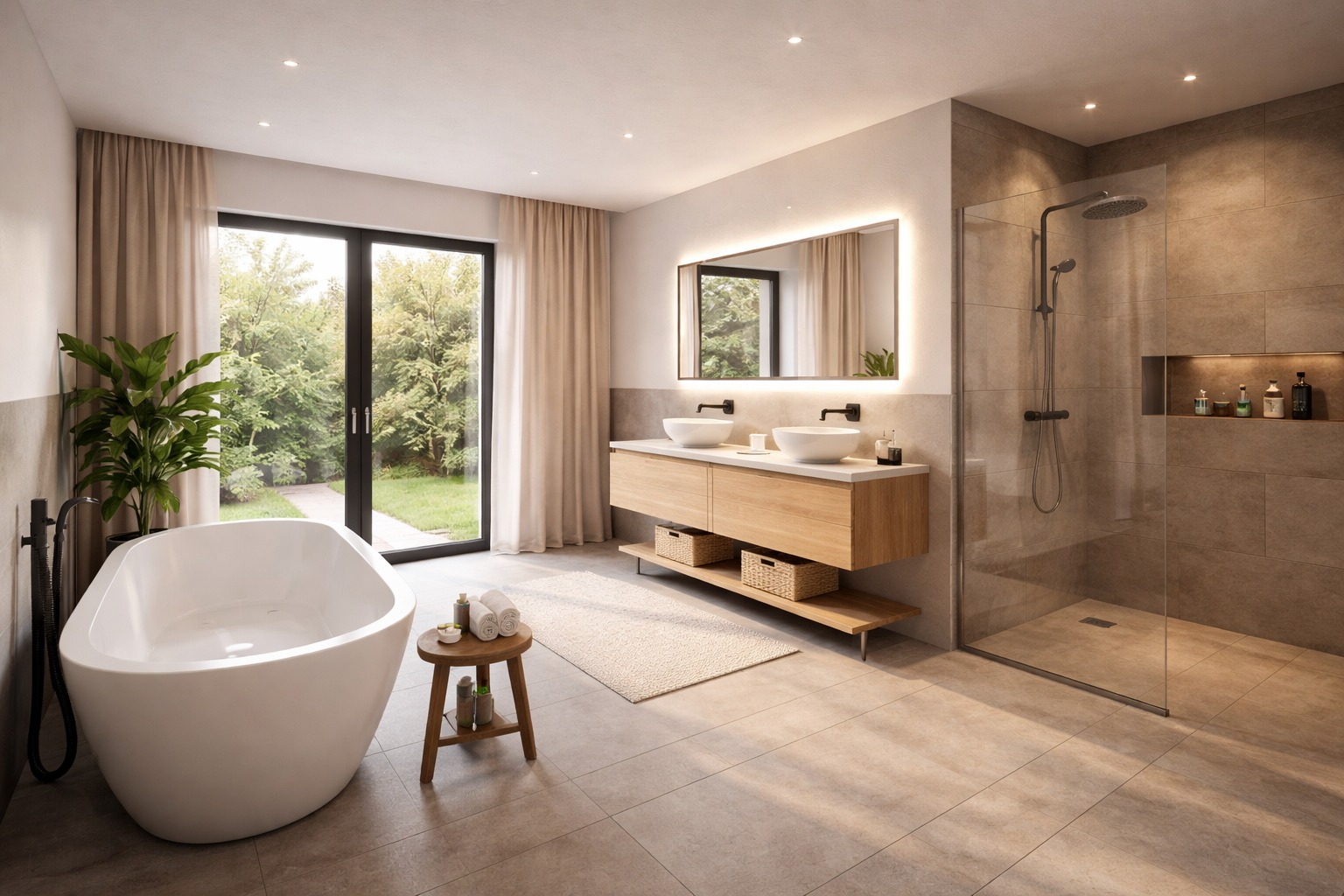 – Bad mit Wanne, Dusche, 2x Waschbecken und WC